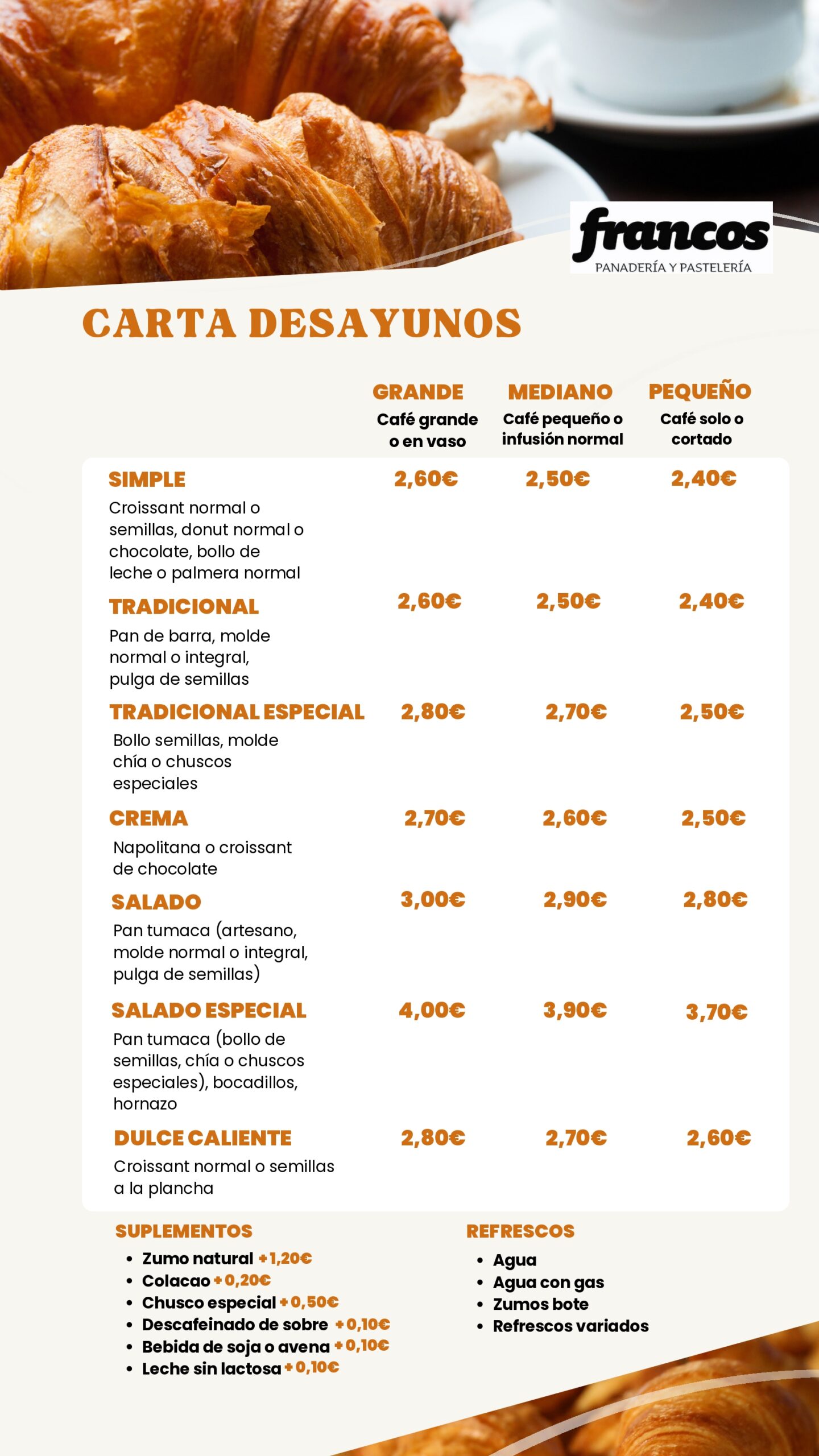 En Panadería Francos, nos enorgullece traerte lo mejor de la panadería artesanal con un toque de auténtico encanto francés. Desde croissants dorados hasta baguettes crujientes, cada producto que sale de nuestro horno está impregnado de tradición y sabor inigualable.