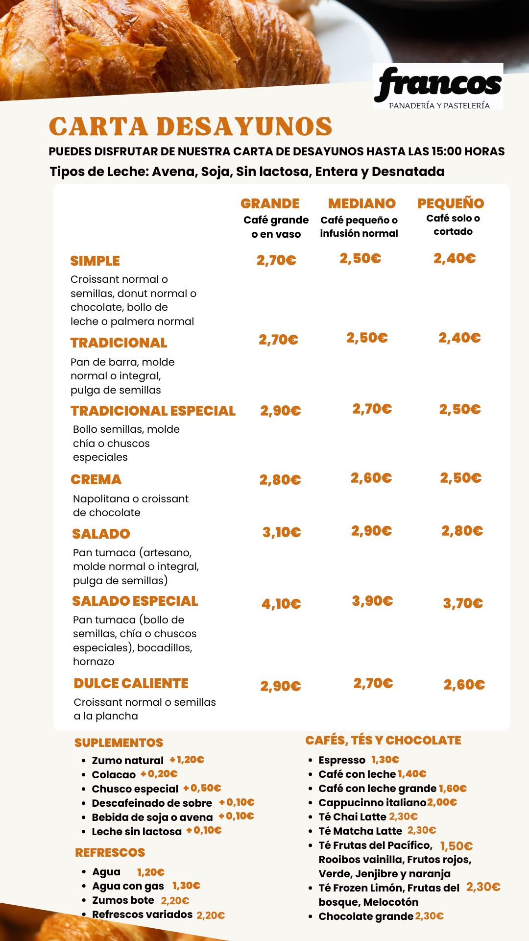 En Panadería Francos, creemos en ofrecerte lo mejor en frescura y calidad. Nuestros productos se hornean diariamente para garantizar que lleguen a tu mesa con todo su sabor y frescura intactos.